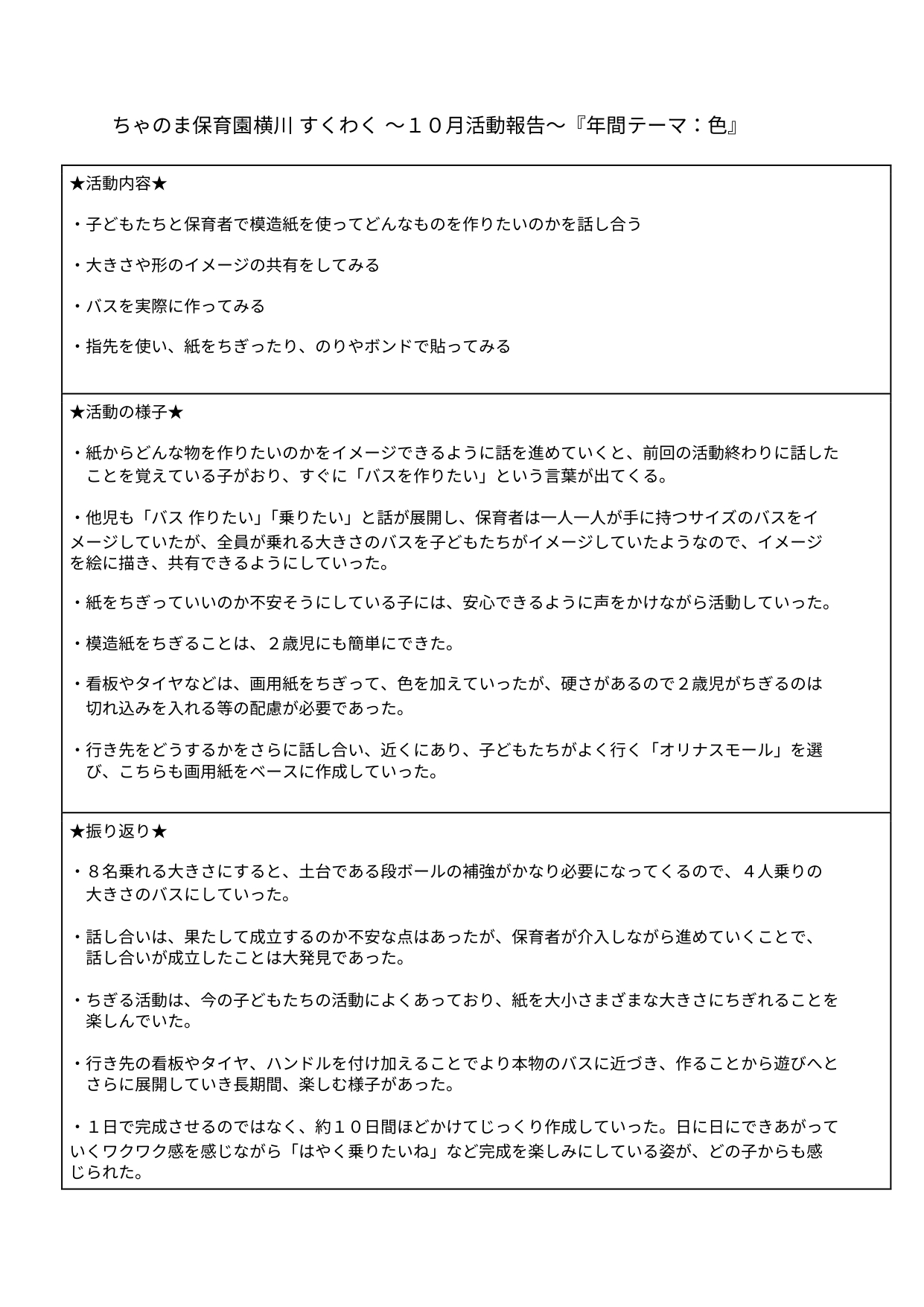 とうきょうすくわくプログラム 活動報告10月(横川) | 「ちゃのま保育園」墨田区のお母さんがつくる地域密着型保育園